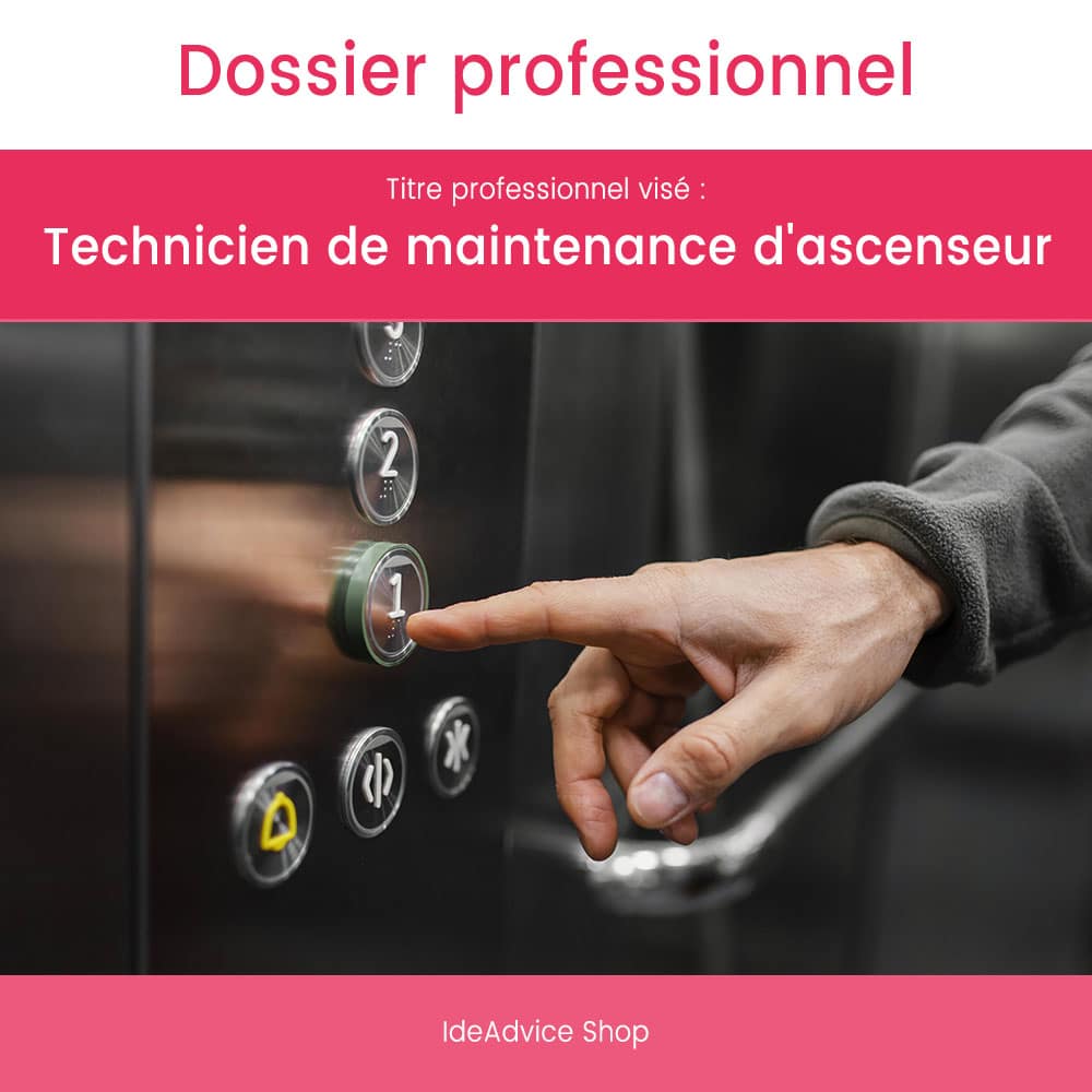 Ce dossier professionnel est le support idéal pour les stagiaires de la formation Technicien de maintenance d’ascenseur qui préparent les épreuves du Titre Professionnel. Le dossier professionnel fait partie intégrante du processus de certification. Il est consulté par les membres du jury professionnel durant la session d’examen, c’est pourquoi il est important de soigner la présentation et la rédaction de votre dossier.